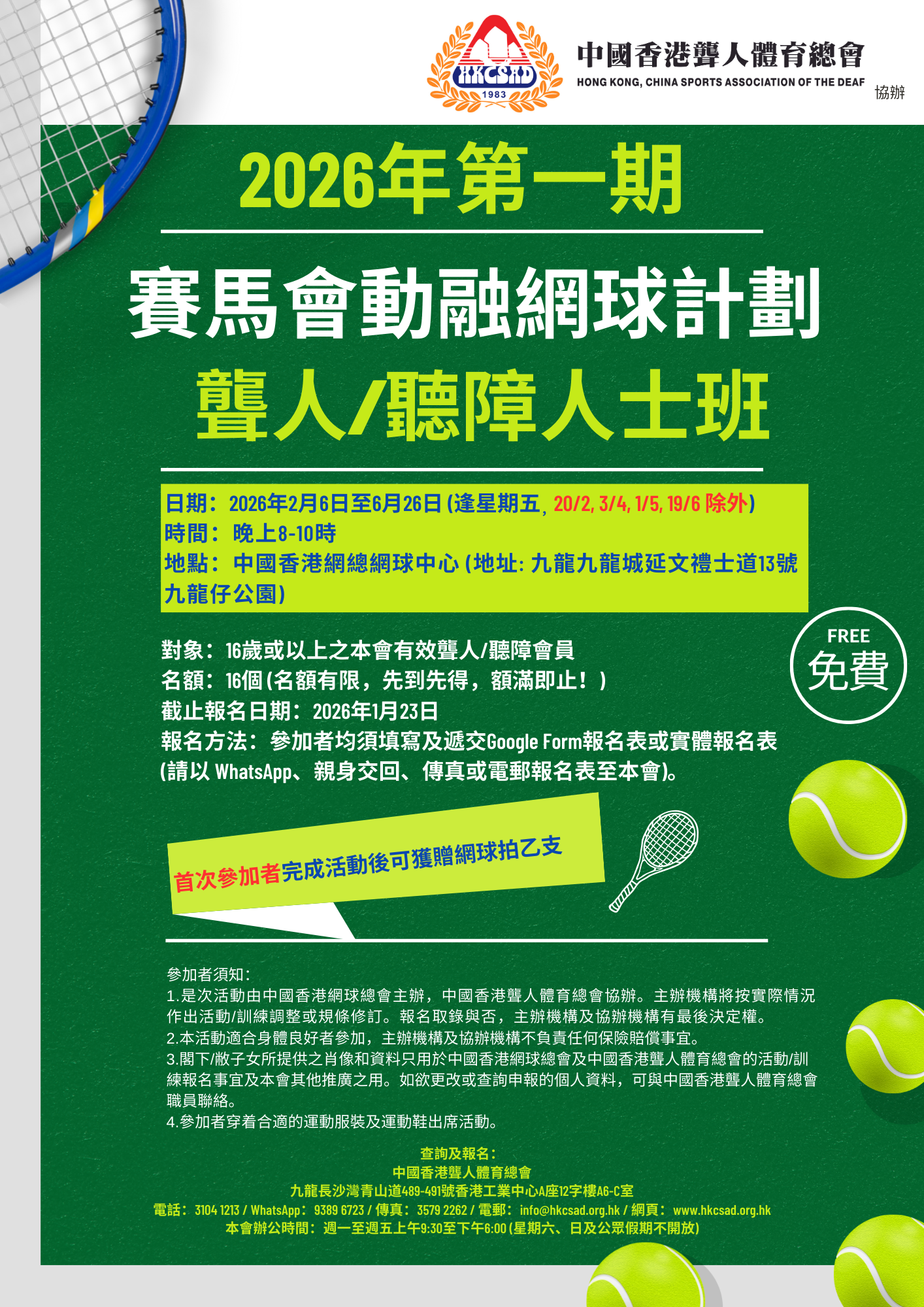 1. 是次活動由中國香港網球總會主辦,中國香港聾人體育總會協辦。主辦機構將按實際情況作出活動/訓練調整或規條修訂。報名取錄與否,主辦機構及協辦機構有最後決定權。